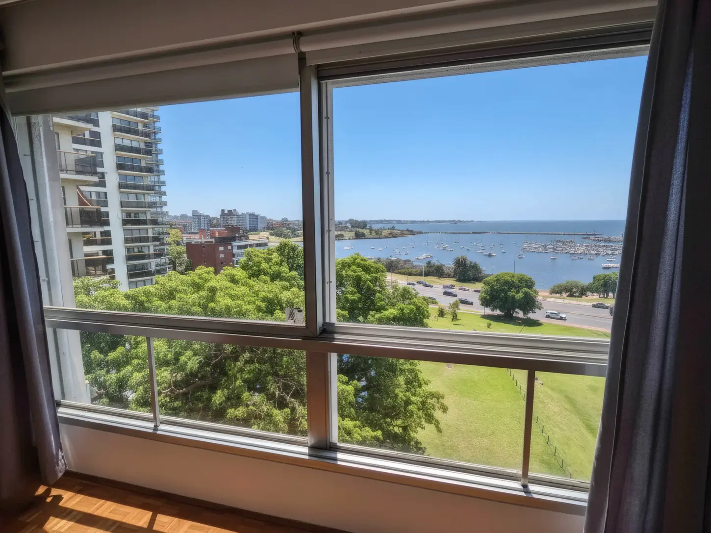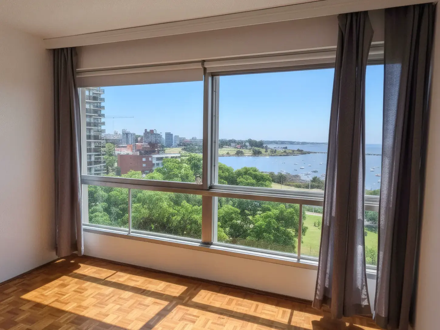 El living comedor destaca por su amplitud y por los ventanales de gran tamaño que enmarcan la bahía y el entorno verde del parque, creando un ambiente ideal para disfrutar del paisaje y del movimiento de la costa.